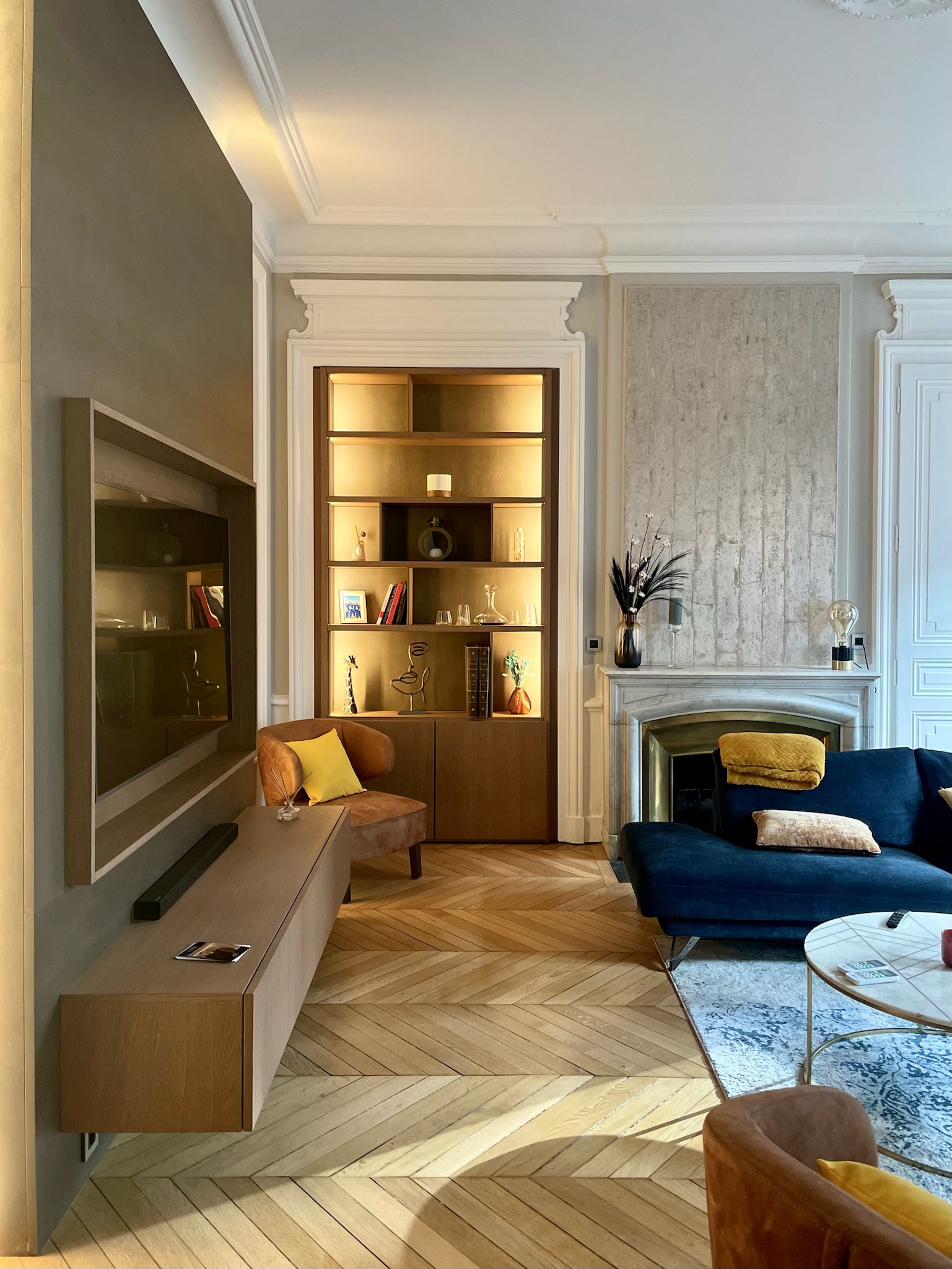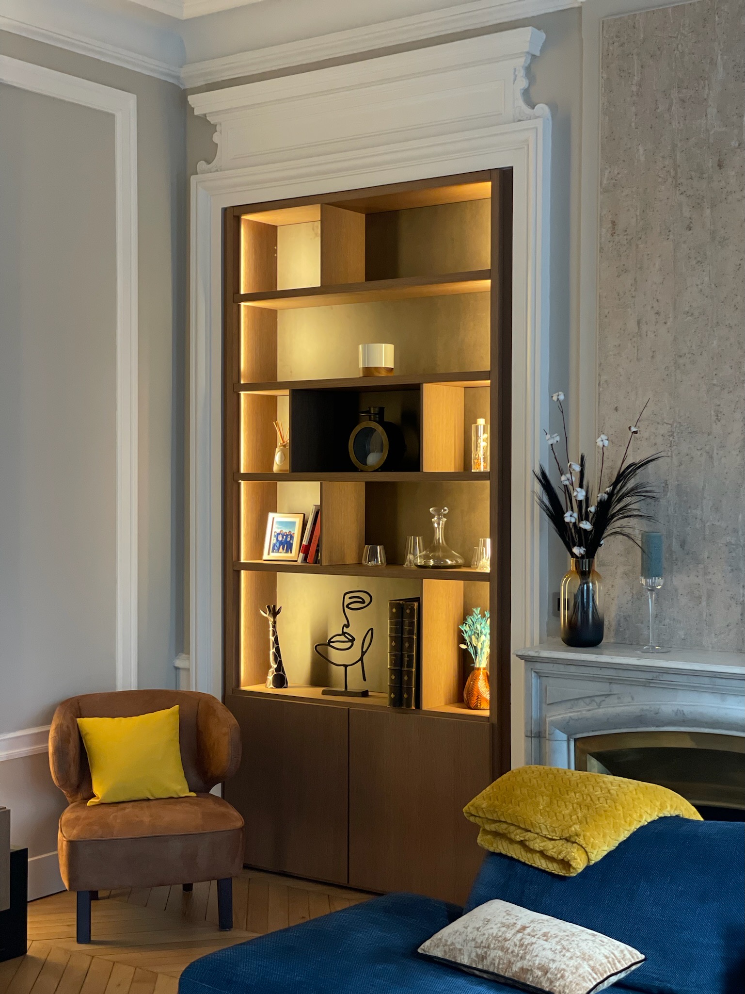 - Bibliothèque sur-mesure à fond doré