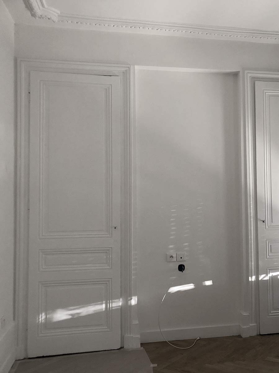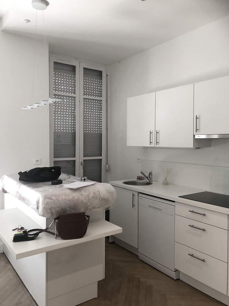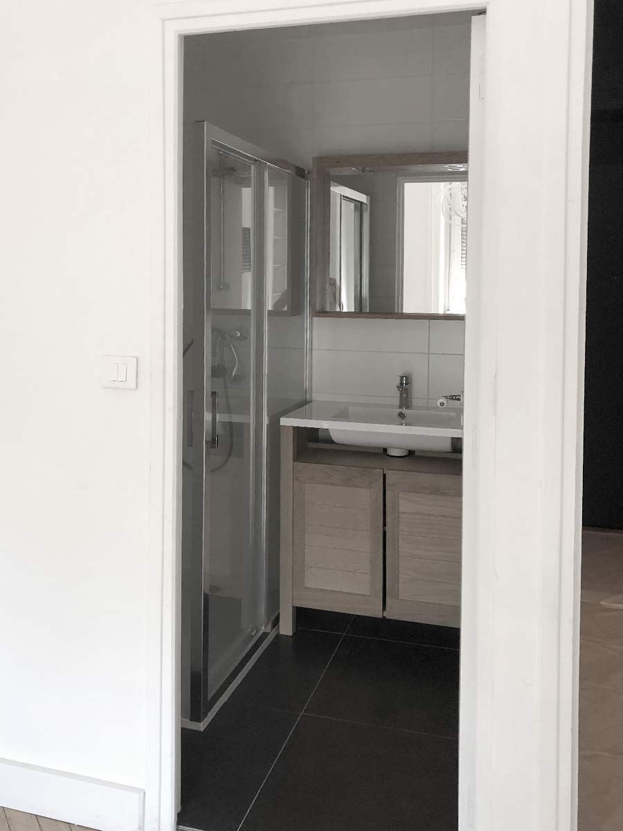 Rénovation complète d'un petit appartement ancien avec décloisonnement total pour créer un espace de vie unifié, salle de bains intégrée et rangements sur-mesure.