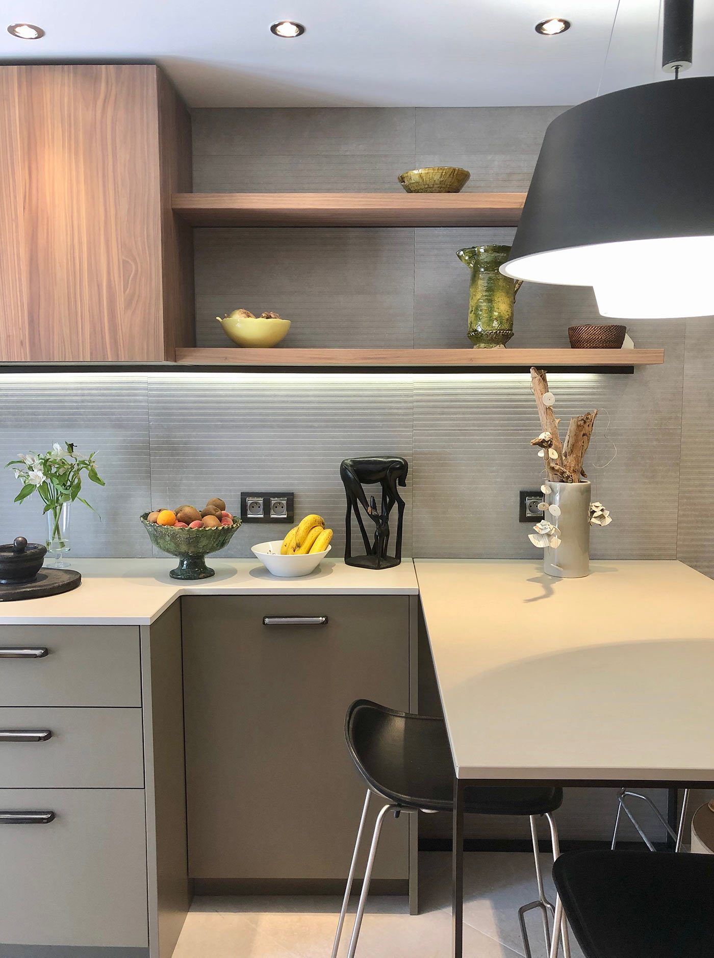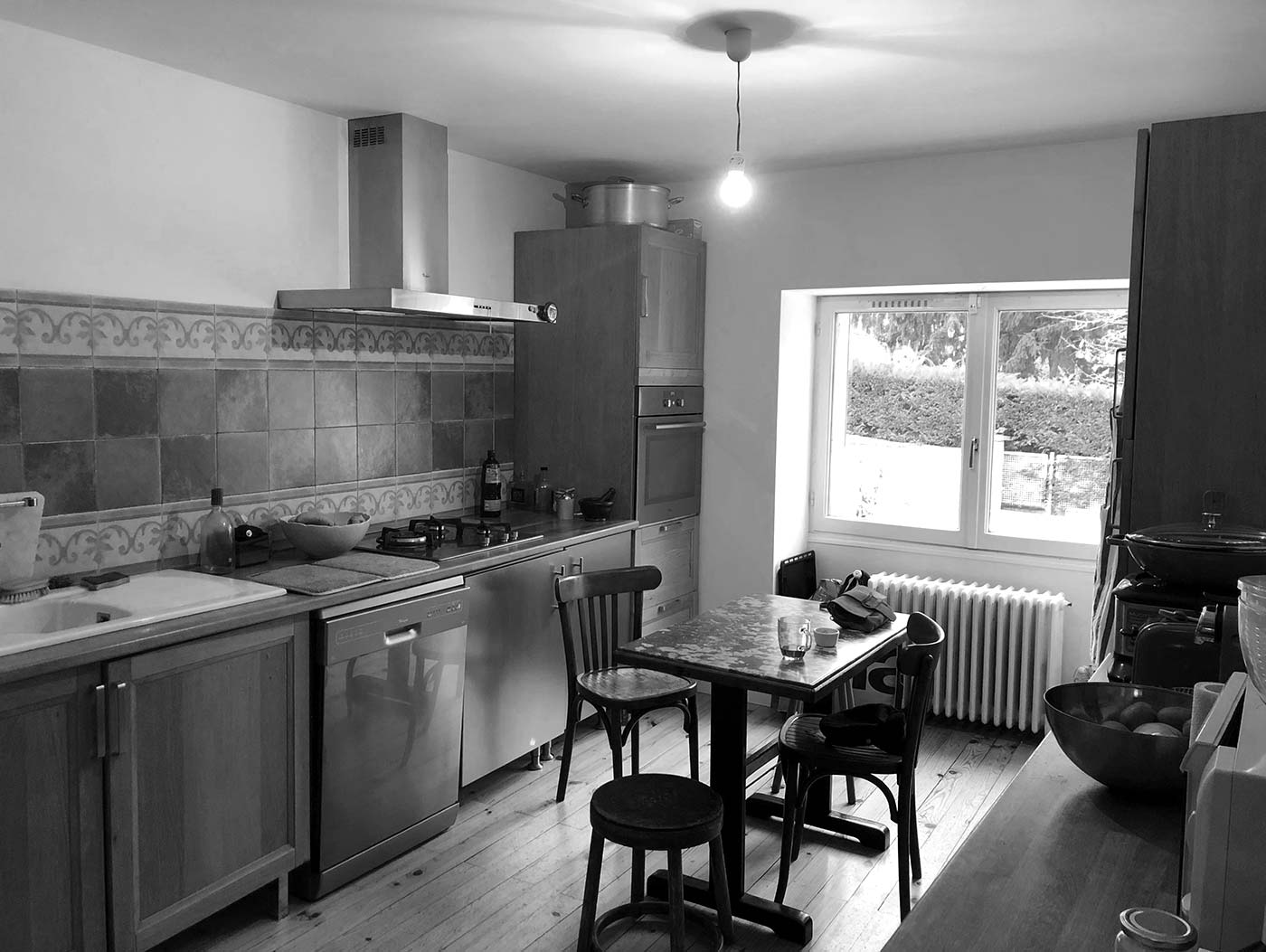 Rénovation d'une maison de village avec cuisine ouverte et rangements généreux, sol pierre format chevron et personnalisation d'inspiration ethnique.