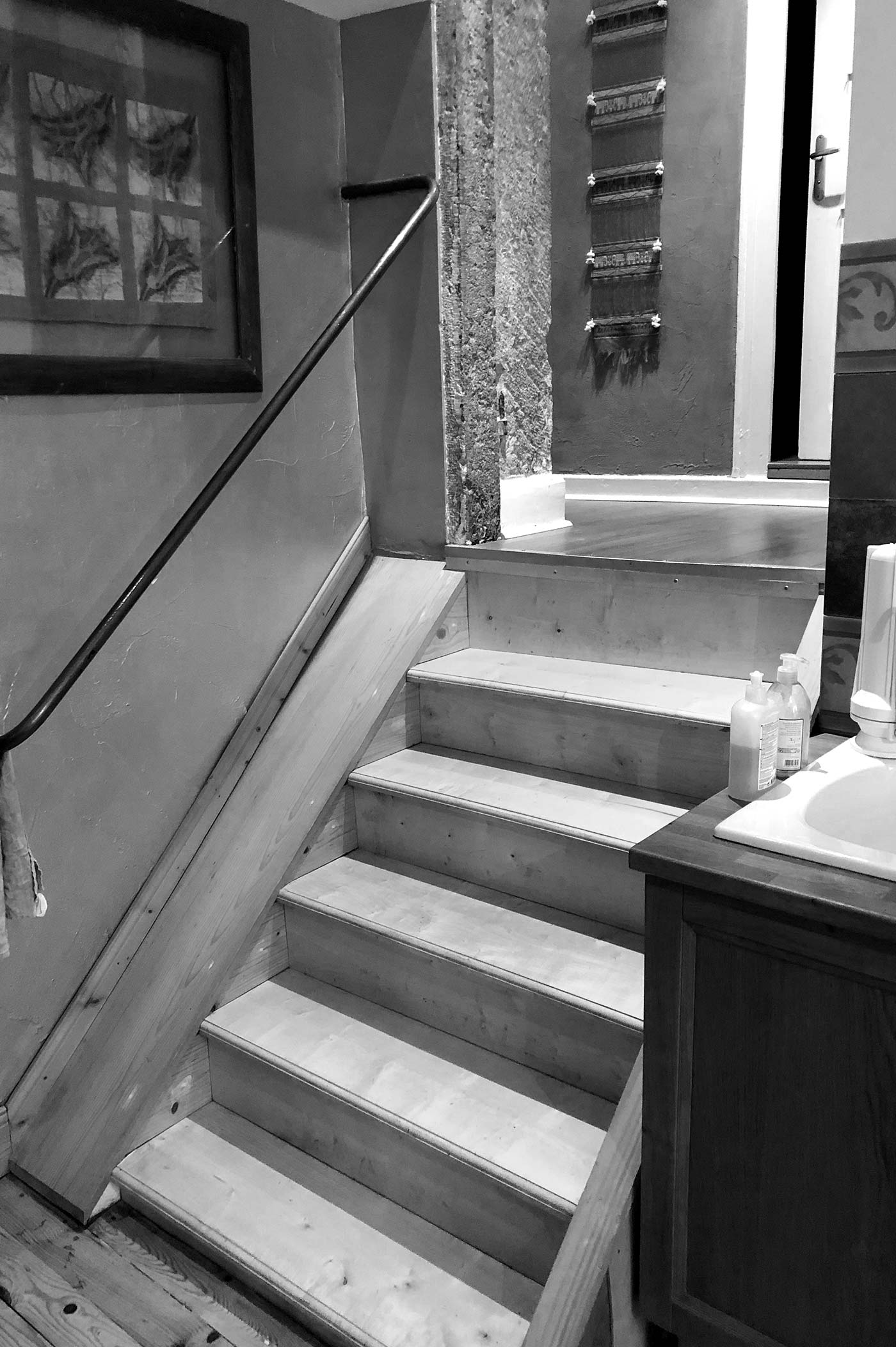 Pierre chevronBois massifMétal noirCarrelage artisanal